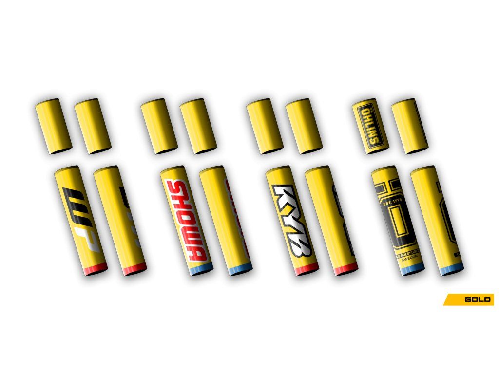 Front suspension sticker set includes 4 pieces. Two stickers are designed for the upper fork area between the triple clamps, and two for the mid-section of the fork, typically featuring a logo.