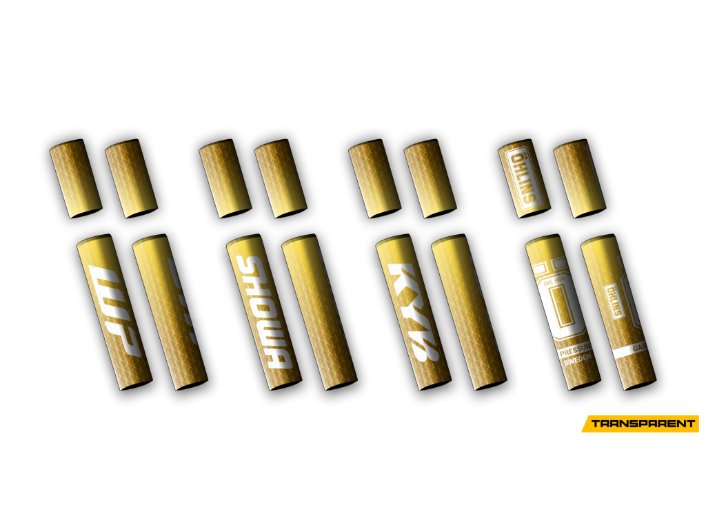 Front suspension sticker set includes 4 pieces. Two stickers are designed for the upper fork area between the triple clamps, and two for the mid-section of the fork, typically featuring a logo.