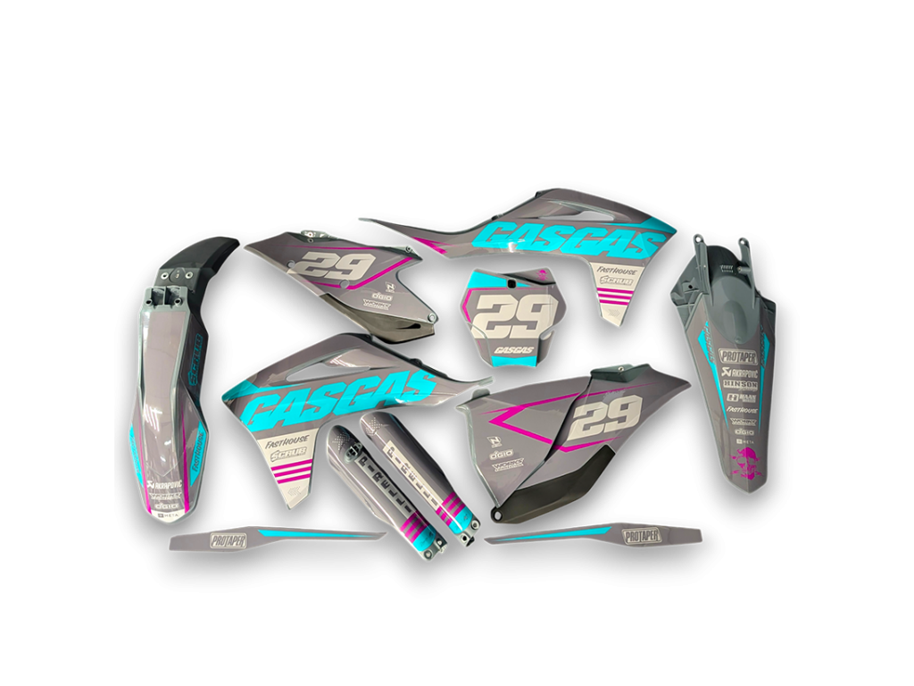Die Kits bleiben mit Fahrername und Startnummer anpassbar, ohne dass Sie die Grafiken selbst montieren müssen. Jedes Kit wird auf Bestellung gefertigt.