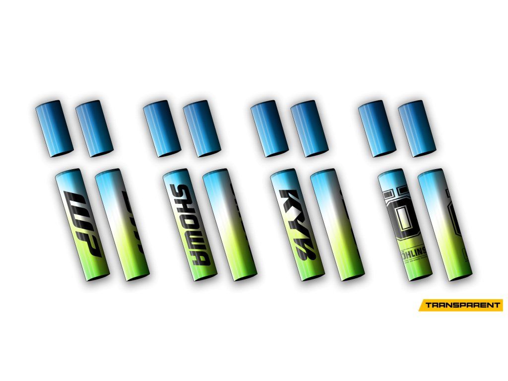 El kit de pegatinas para la suspensión delantera incluye 4 piezas. Dos pegatinas están diseñadas para la parte superior de la horquilla entre las tijas, y dos para la sección media de la horquilla, normalmente con un logotipo.