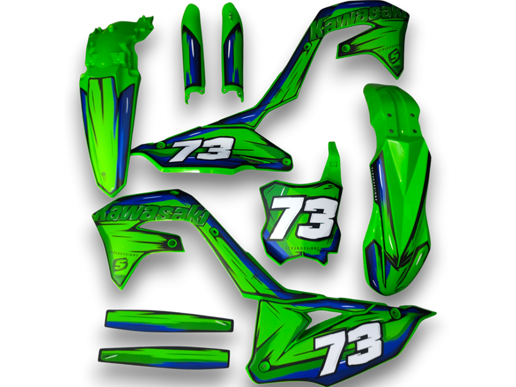 Los kits GFP incluyen plásticos nuevos con gráficos aplicados profesionalmente por el equipo de Scrub Designz. Se suministran listos para instalar en su motocicleta.