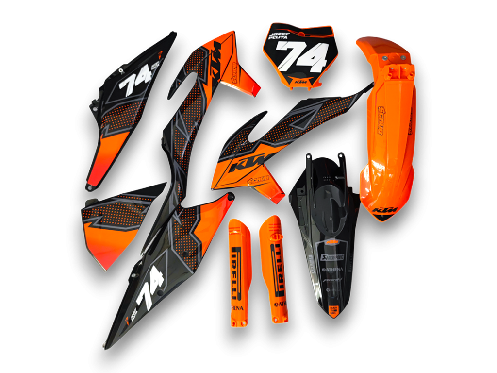 Los kits GFP incluyen plásticos nuevos con gráficos aplicados profesionalmente por el equipo de Scrub Designz. Se suministran listos para instalar en su motocicleta.