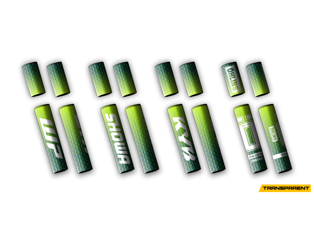 Le kit d’autocollants pour la suspension avant comprend 4 pièces. Deux autocollants sont conçus pour la partie supérieure de la fourche entre les tés de fourche, et deux pour la partie centrale de la fourche, généralement avec un logo.