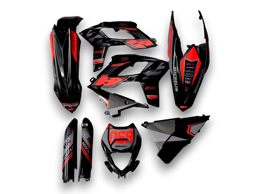 Les kits GFP comprennent de nouveaux plastiques avec des graphismes appliqués professionnellement par l’équipe Scrub Designz. Ils sont fournis prêts à être installés sur votre moto.