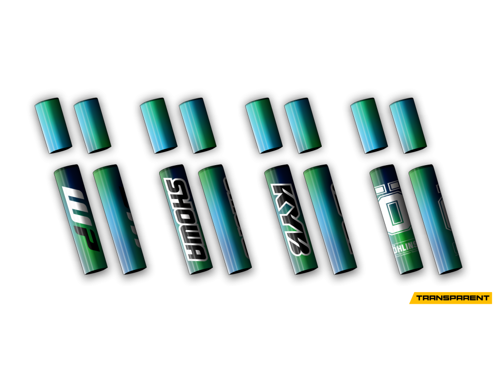 Il set di adesivi per la sospensione anteriore include 4 pezzi. Due adesivi sono progettati per la parte superiore della forcella tra le piastre di sterzo, e due per la sezione centrale della forcella, solitamente con un logo.
